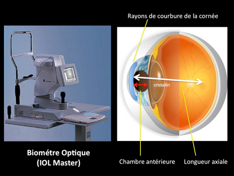 Elles ne nécessitent aucun contact avec l'œil. La longueur de l'œil, les rayons de courbure de la cornée, et la distance entre la cornée et le cristallin (profondeur de la chambre antérieure) sont mesurés. Ces données sont intégrées dans des formules mathématiques qui vont prédire la puissance théorique idéale de l'implant.