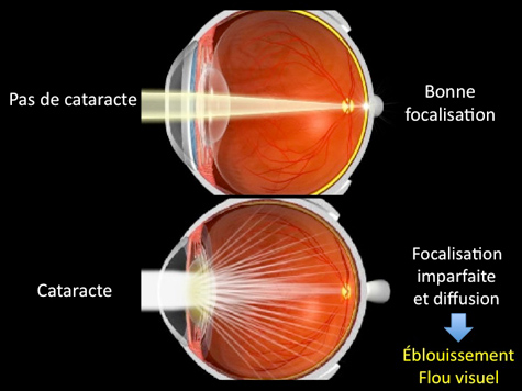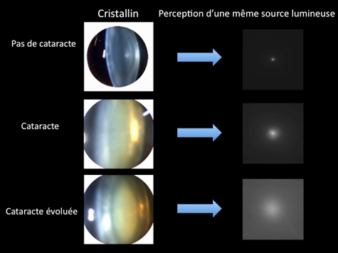 La cataracte correspond à l’opacification progressive du cristallin, survenant de manière inéluctable avec l’âge. On considère que 20 % de la population est atteinte à partir de 65 ans, et 75 % après 85 ans.