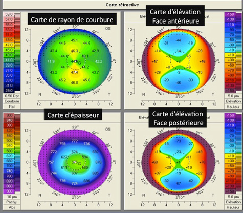 L’analyse de la forme de la face postérieure de la cornée, et de la carte d’épaisseur apporte des éléments complémentaires à la topographie spéculaire pour le dépistage d’un kératocône infra-clinique en préopératoire.