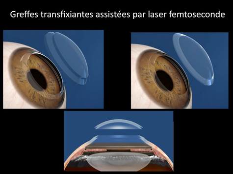 Toutes les couches de la cornée sont remplacées (greffe totale). La cornée receveuse est trépanée sur 360° et sur un diamètre proche de 8 mm.