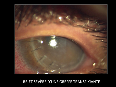 Le rejet du greffon est secondaire à la reconnaissance des cellules endothéliales (plus rarement du stroma ou de l’épithélium) du greffon par le receveur. L’immunité essaie alors de détruire les cellules greffées. Les symptômes sont un œil rouge, photophobe, douloureux et/ou un brouillard visuel. Une consultation en urgence est nécessaire dans ce cas. Le traitement repose sur la mise en route immédiate d’une corticothérapie intensive. La rapidité du diagnostic et du traitement conditionne le pronostic. En effet, plus on attend, plus le nombre de cellules endothéliales détruit est important. Si le nombre de cellules demeurant viables est faible, un œdème irréversible du greffon se produit.