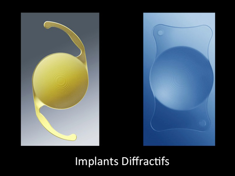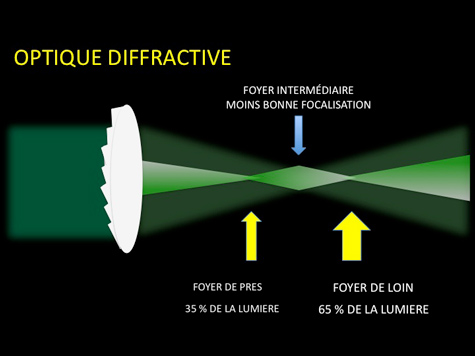 Les implants multifocaux les plus employés de nos jours sont les implants diffractifs. Une série de marches concentriques permet de séparer la lumière en deux foyers, l’un permettant de voir de loin et l’autre de près sans lunettes.