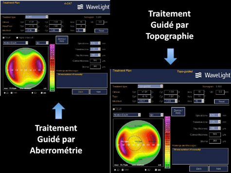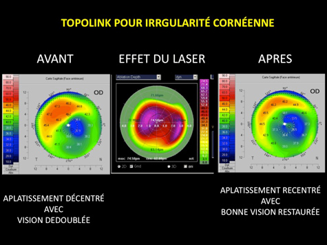 La précision est telle, que dans certains cas rares, notamment dans des cas de reprise d’interventions anciennes par laser d’anciennes générations, par kératotomies radiaires, ou après traumatismes, il est possible de traiter des défauts optiques appelés aberrations optiques de haut degré, qui impactent la qualité de vision nocturne principalement, et même parfois l’acuité visuelle. On parle de traitement personnalisé guidé par topographie cornéenne (TOPOLINK) ou aberrométrie. Il s’agit de cas particuliers.
