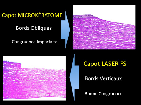 Les microkératomes ont une précision inférieure, notamment avec une variabilité importante dans la profondeur de découpe. Les risques d’ectasie sont de ce fait plus importants. Les bords sont très peu angulés (seulement 30° environ). La géométrie du capot dépend des paramètres cornéens.